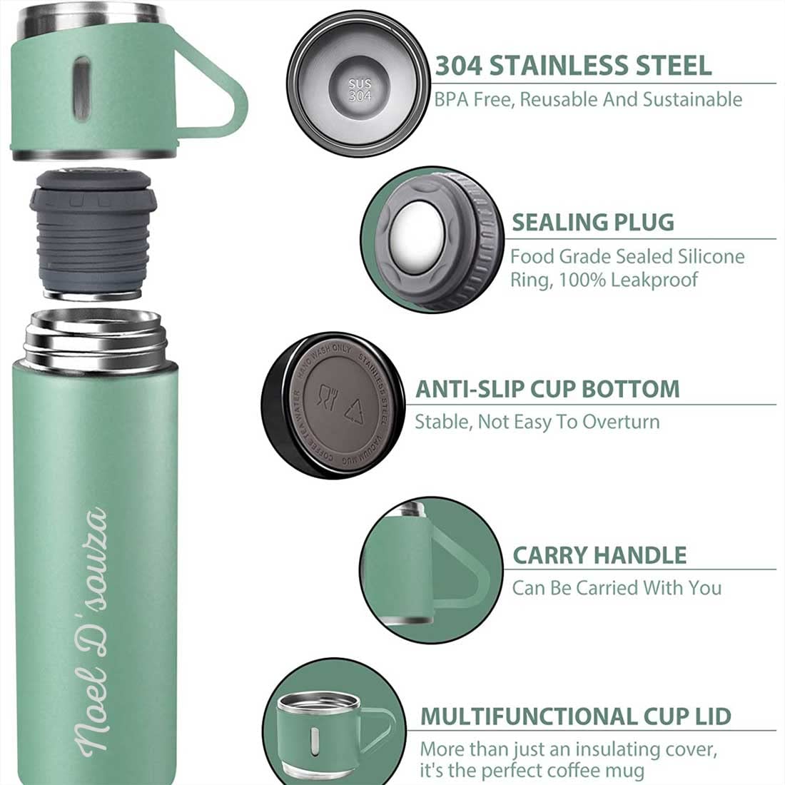 Personalized Stainless Steel Vacuum Flask Set with 3 Cups Combo for Coffee Hot Drink and Cold Water Flask Ideal Gifting Travel Friendly Latest Flask Bottle. 500ml