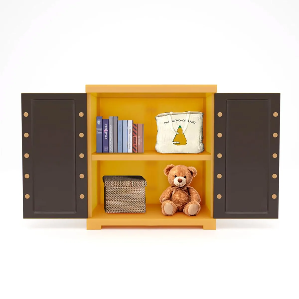 The cabinet features a spacious interior with well-balanced shelving that allows you to neatly store books, toys, daily essentials, documents, décor items, or household accessories. The dual-door design keeps your belongings protected from dust while maintaining a clutter-free appearance. Smooth-opening doors ensure easy access, making daily use comfortable and convenient.